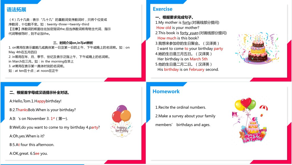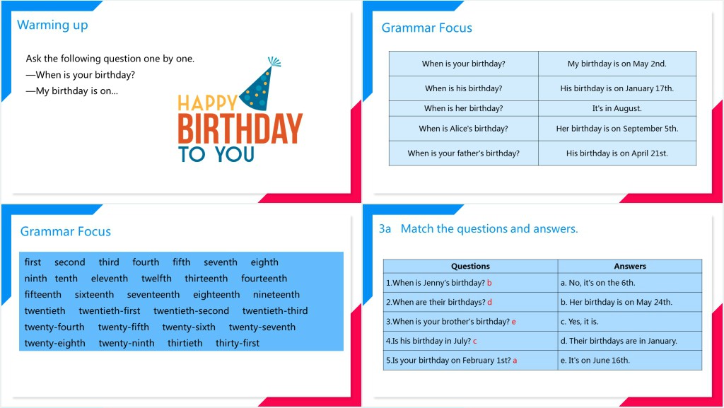 当是你的生日?这个问题常常让人感到兴奋和期待。在第二课时中,我们将探讨生日的意义和庆祝方式。通过互动和讨论,我们将分享彼此的生日经历,并了解不同文化中对生日的重视程度。让我们一起来探索生日背后的故事和习俗,共同体会生日带来的喜悦和快乐!