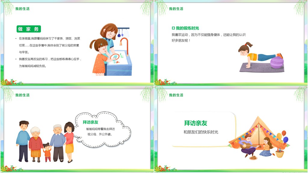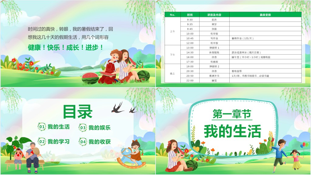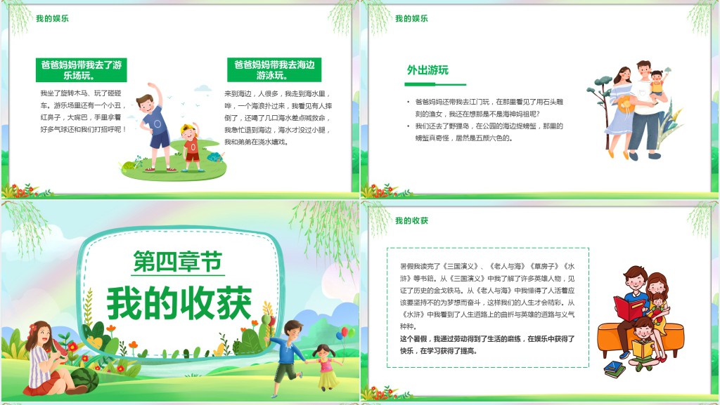 首先,我们将从迎接夏日的序幕开始,用生动的图像和清新的色彩,带领大家步入那充满阳光与活力的季节。随后,每位同学的暑期故事将依次登场,无论是远足探险、学习成就、家庭聚会,还是志愿服务经历,每个环节都配以符合主题的视觉元素,让听众仿佛亲身经历,感受那份独特的情感和收获。