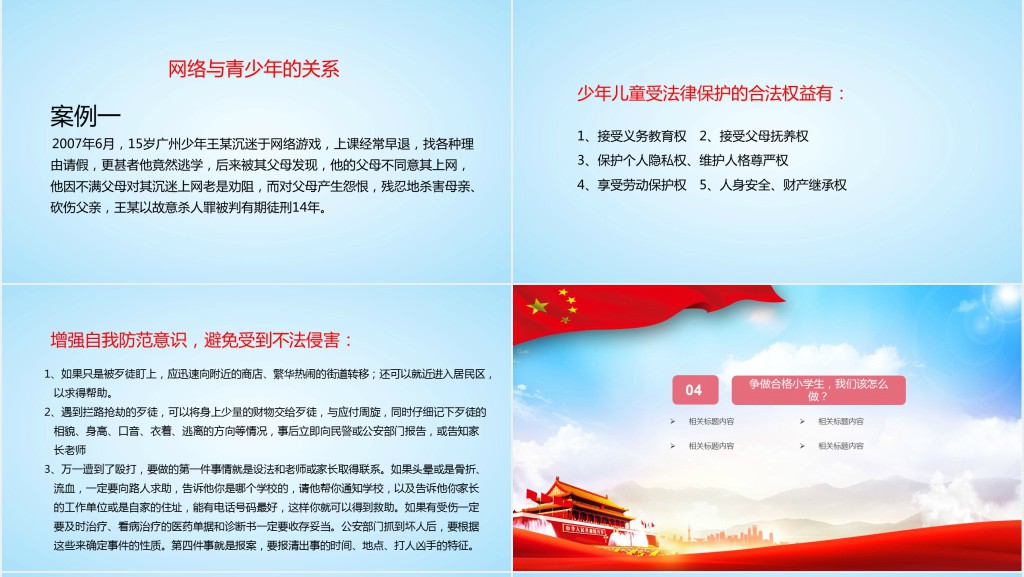 在另一个场景中,小明的朋友小红遇到了欺凌问题。小明帮助小红了解了法律对欺凌行为的禁止,并鼓励小红勇敢地向老师和家长寻求帮助。通过这个故事,学生们了解到了自己应该如何应对欺凌行为,并且认识到法律对于保护每个人的安全和尊严的重要性。