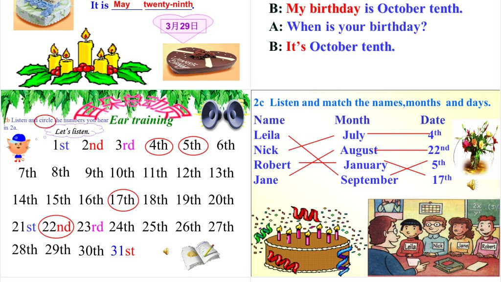 本次分享旨在探讨一个常见但富有意义的话题:“Whenisyourbirthday?”这个问题不仅是英语学习者常遇到的实际对话场景,也是了解他人、建立社交联系的重要入口。通过本次内容,我们将深入了解如何用英语询问和回答生日日期,同时掌握相关的词汇、表达方式和文化差异。首先,我们会介绍基本的问答结构,确保每位参与者都能够用英语准确地询问和告知生日日期。接着,将通过实例演示如何在不同的社交场合中自然而然地引入这个话题,无论是在正式的商务交流中,还是在轻松的朋友聚会上。此外,本次分享还将涵盖一些扩展词汇和习语,帮助大家丰富对话内容,使交流更加生动有趣。比如,如何描述生日庆祝的传统习俗,以及在英语国家中生日庆祝的一些特别做法。最后,我们会探讨一些文化注意事项,理解在不同文化背景下提及生日可能存在的敏感性。通过对这些细节的关注,可以避免潜在的文化误解,使交流更加顺畅。整个分享旨在通过互动和实践,不仅提高英语交流技能,也增进对不同文化的理解和尊重。希望每位参与者都能在轻松愉快的氛围中学习和成长。