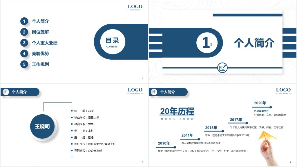 大学办公室主任竞聘报告的设计应注重简洁明了,突出关键信息,体现出候选人的专业素养和管理能力。整体风格可采用大学校园元素为背景,以展示出对学校的热爱与归属感。在内容排版上,建议采用清晰的结构布局,突出关键信息点,避免信息过于密集。同时,可适当运用图表、统计数据等方式,直观呈现候选人的工作成绩与管理经验。在配色方面,建议选择温和且具有亲和力的色调,既符合大学环境的氛围,又能够凸显出候选人的稳重与可靠性。