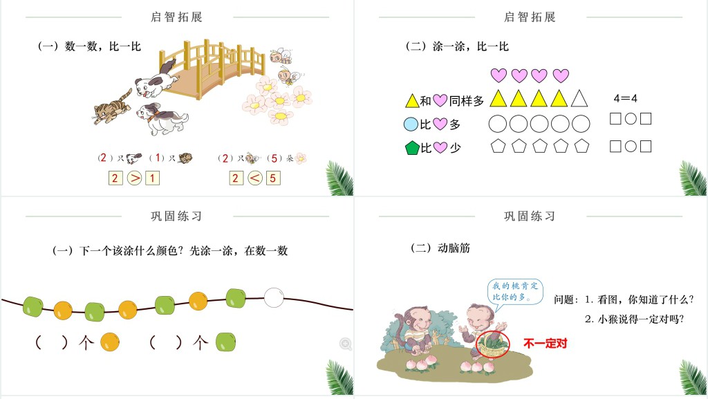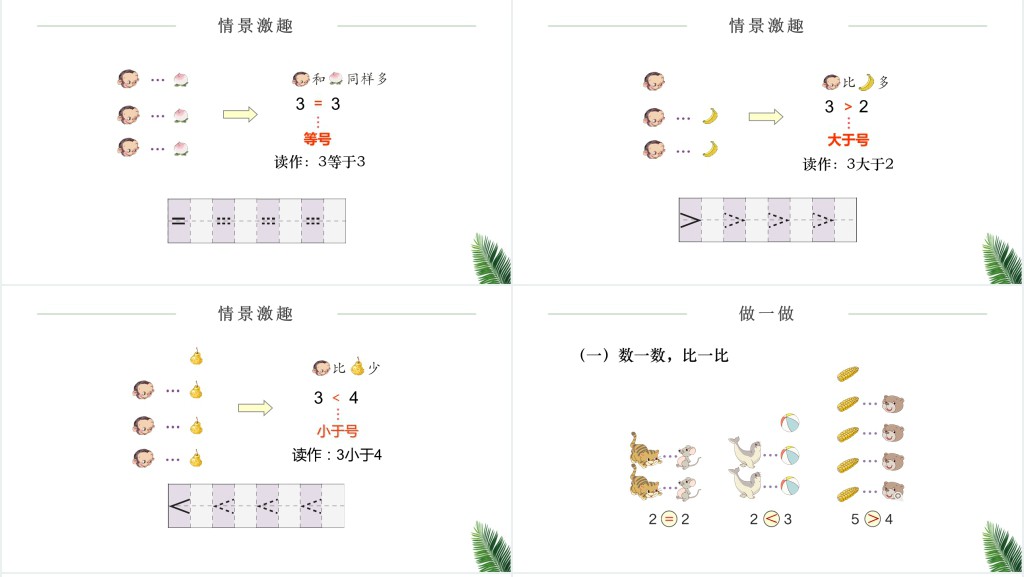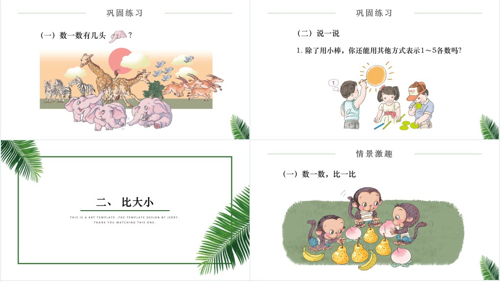 这节课主要介绍了小学一年级学生对数字1到5的认识和加减法的基本概念。通过生动有趣的教学方式,引导学生从日常生活中认识和理解这些数字,以及数字之间的大小关系。同时,通过实际操作和互动练习,帮助学生初步掌握数字1到5的加法和减法运算方法,培养他们对数字的感知和运算能力。