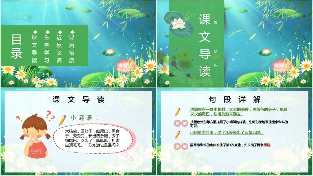 这套人教版小学二年级语文上册小蝌蚪找妈妈课文PPT课件属于内容型,已包含实质内容,可直接使用!