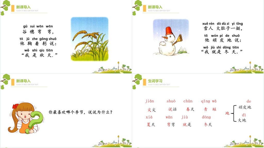 这篇课文主要介绍了四季的变化,包括春天万物复苏、夏天炎热舒适、秋天果实累累和冬天寒冷凝重。通过描绘大自然的变化,引导孩子们观察和感受四季的不同特点,提高他们的环境意识和对自然界的热爱。此外,课文还通过生动有趣的描写和情感表达,激发孩子们对大自然的好奇心和探索欲望,培养他们的阅读兴趣和语言表达能力。