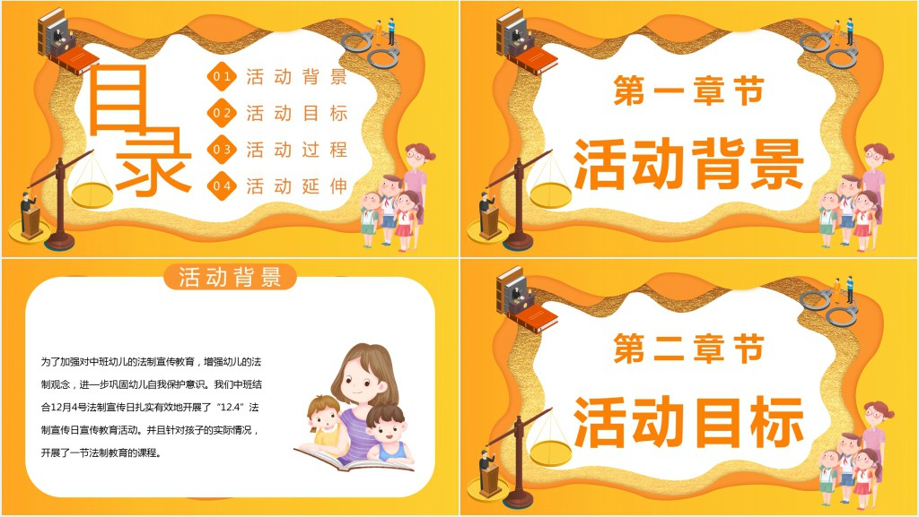 这套幼儿园校园法制教育活动PPT模板属于内容型,已包含实质内容,可直接使用!