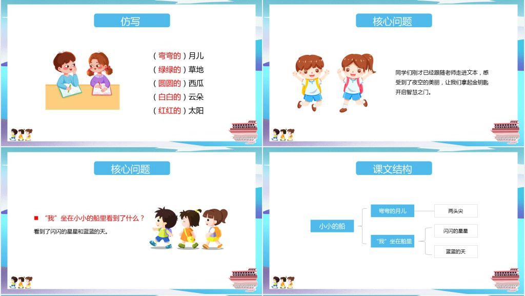 这套小学一年级语文上册《小小的船》PPT课件属于内容型,已包含实质内容,可直接使用!