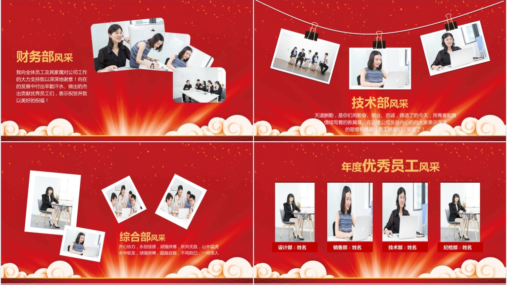这个红色员工风采展示设计师以充满激情和活力的红色作为主色调,突显出团队的朝气和活力。整体设计简洁大方,将员工们的工作场景与生活状态巧妙结合,展现出他们的工作热情和积极向上的精神风貌。同时,设计师还通过图文并茂的方式,生动展示了员工们的工作成果和团队活动,使观众更加直观地感受到团队的凝聚力和活力。整个展示设计富有创意,让人留下深刻的印象,展现出了团队的无限活力和朝气蓬勃的形象。