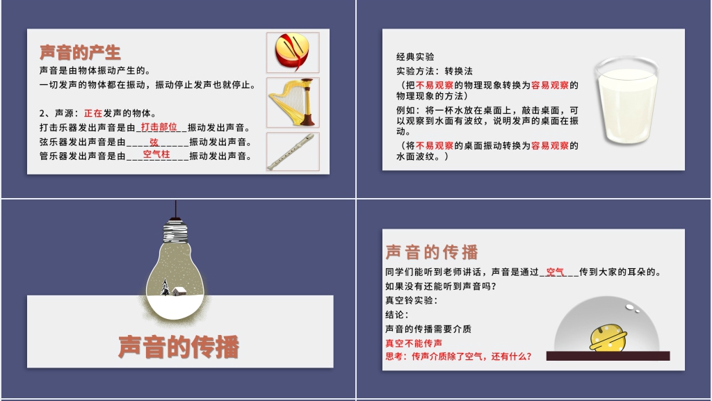 在声音的产生方面,课程会讲解声音是由物体振动引起的,并介绍了声音的振动源和传播媒质。学生将学习声音的产生条件和振动的特点,了解不同物体振动时产生的声音差异。