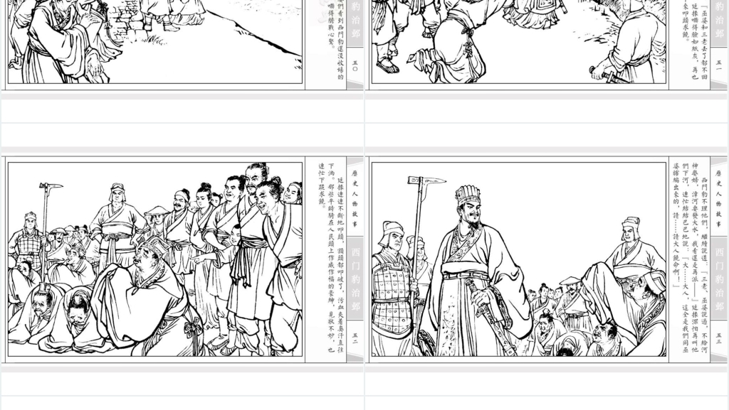 西门豹治邺是中国古代历史上的一个著名故事,也有相关的连环画作品。以下是对《西门豹治邺》连环画故事的赏析: