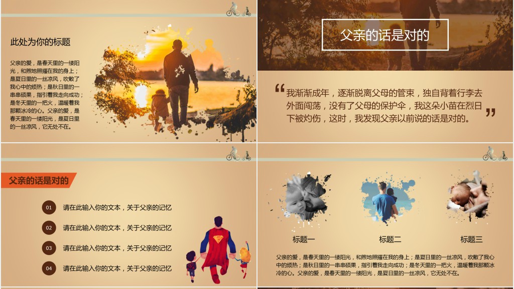 这套父爱无言父爱无边父亲节主题PPT模板属于内容型,已包含实质内容,可直接使用!