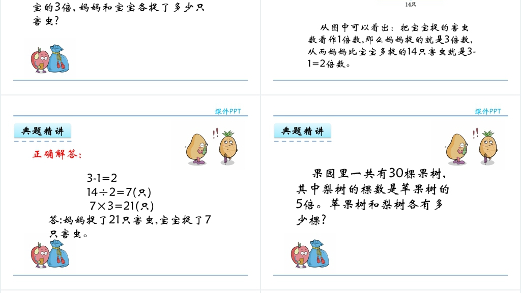2. 课文解读:逐段解读《倍的认识》的课文内容,引导学生理解倍数的定义和计算方法。
