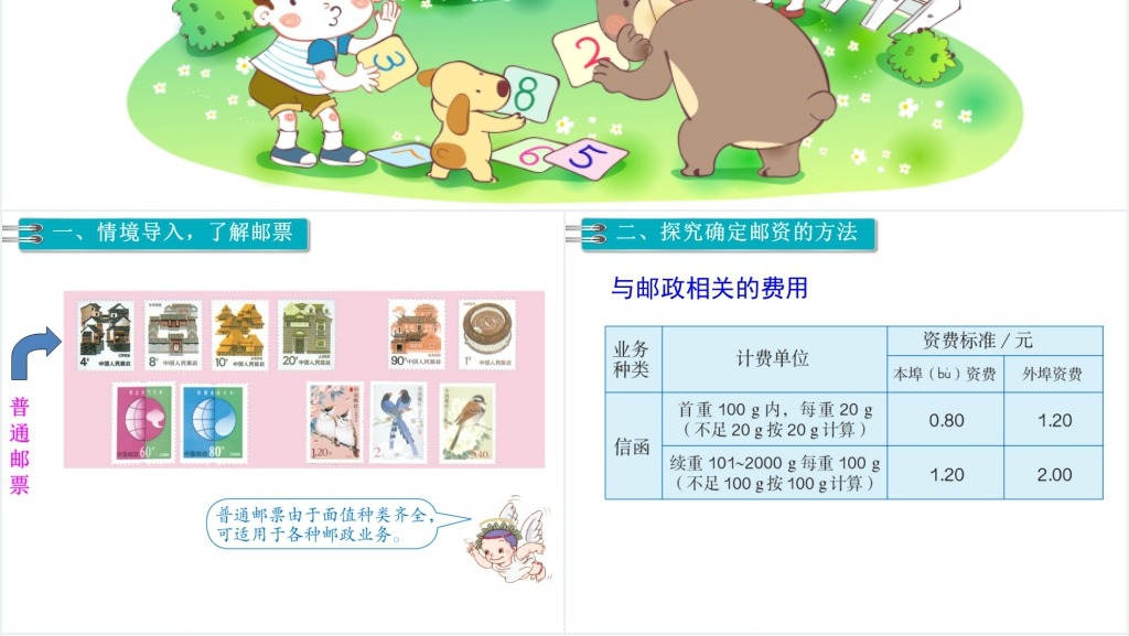 2. 邮票中的数学问题:介绍邮票中的数学问题,帮助学生理解问题的背景和要求。