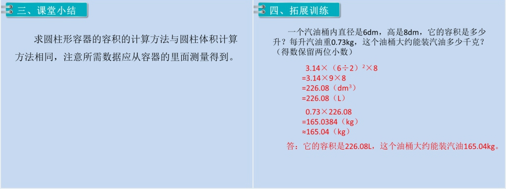 4. 计算练习:让学生进行一些计算圆柱体积的练习题目,包括已知体积和半径、已知体积和高度、已知表面积的情况。通过实际操作让学生掌握计算圆柱体积的方法和技巧。