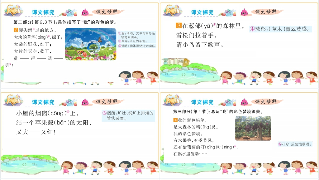 3. 能够运用所学知识,编写自己的彩色梦故事,展示自己的想象力和创造力。