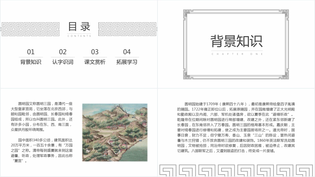 2. 课前导入:教师通过展示圆明园的图片或视频,引起学生对圆明园的思考和探索,并导入本节课的主题。