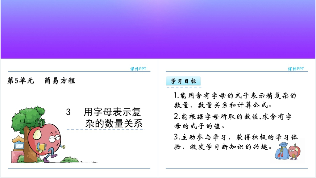 - 知识目标:使学生理解简易方程的概念;学会用字母表示复杂的数量关系;掌握解方程的基本方法。
