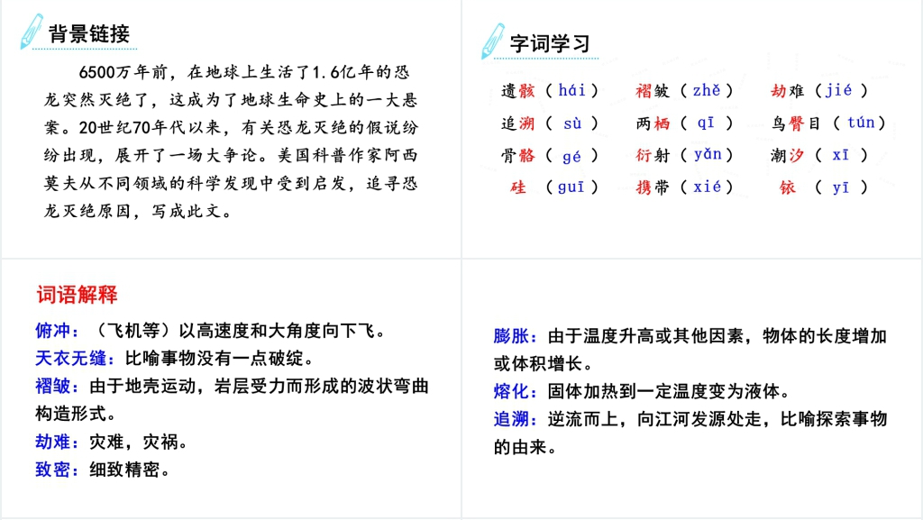 一、内容丰富,信息量大。作者在短短的篇幅中,涉及了地质学、生物学、天文学等多个学科的知识,让读者了解了地球的演变历史、恐龙的分布和特征、小行星撞击的影响等方面的内容,拓宽了读者的视野。