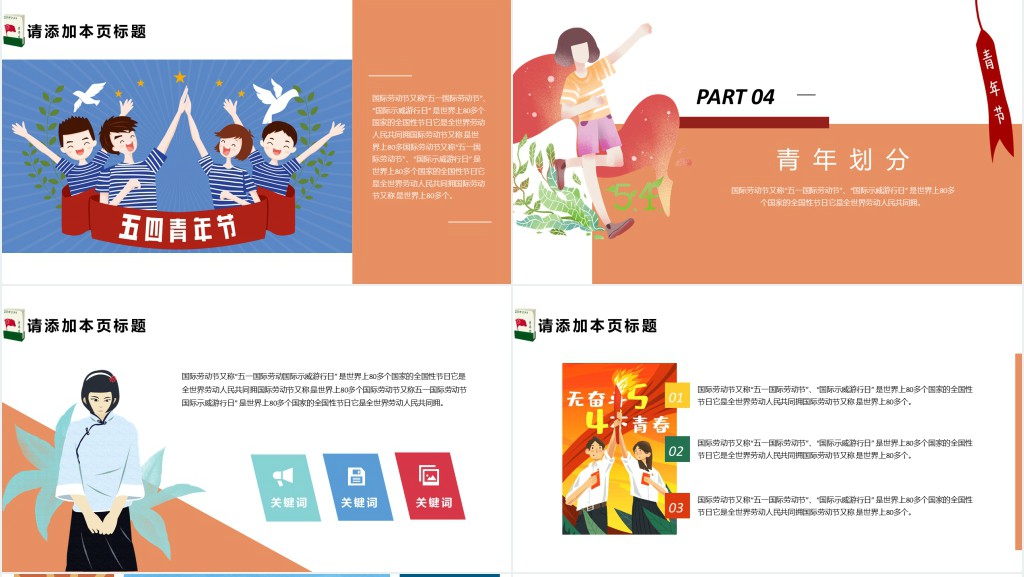 这套校园五四青年节活动策划PPT模板属于内容型,已包含实质内容,可直接使用!