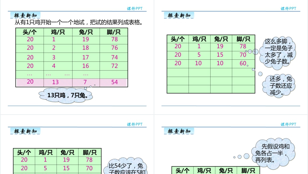 2. 掌握并能运用列表法和假设法解决“鸡兔同笼”问题,比较不同方法的优缺点。