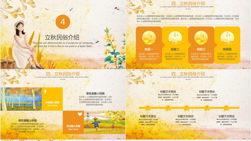 立秋节气,秋高气爽,清风徐来。精美的主题展示内容集中展现了立秋时节的自然景色和人们的生活状态。通过鲜艳的色彩和精致的图案,展现了大自然的变化和丰收的喜悦氛围。整个内容设计简洁明快,给人一种清新、舒适的感觉,同时呈现出丰收、成熟和希望的美好寓意。