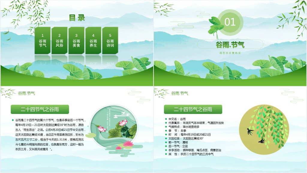 这套二十四节气谷雨节气习俗特色PPT模板属于内容型,已包含实质内容,可直接使用!
