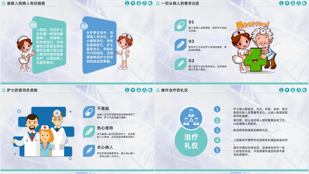3. 行为规范、尊重,与患者或家属保持适当的距离,不随意触摸或拥抱,不表现出轻视或嘲笑的态度,不对患者或家属的信仰或习俗进行评判或干涉。