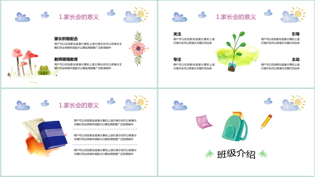 最后,我们来看一下本学期的家园合作。我们非常重视与您们的合作,因为您们是孩子们最重要的教育者和影响者。我们希望您们能够积极参与幼儿园的各项活动,如亲子活动、志愿者活动、家长讲座等,与老师和其他家长建立良好的沟通和信任。同时,我们也希望您们能够在家中给予孩子们适当的引导和支持,如陪伴孩子们阅读、游戏、做手工等,培养孩子们的兴趣和爱好。我们相信,在家园共育的基础上,孩子们一定能够快乐成长,茁壮成长。