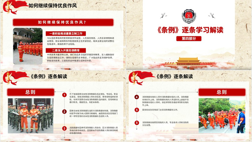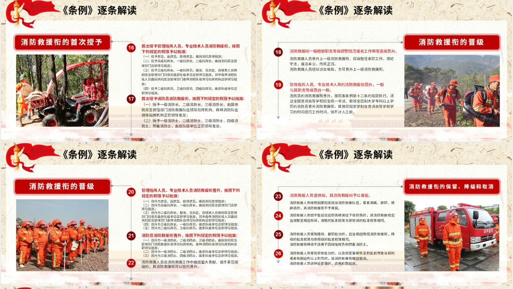 国家消防救援衔条例解读内容详实,涵盖了消防救援衔条例的主要内容和相关政策解读。其中包括了消防救援衔条例的重要性、实施背景、主要内容和具体政策解读等方面的内容,以及对相关条例在实际工作中的应用和执行进行了详尽的解释。通过本次解读,听众可以全面了解消防救援衔条例的相关规定和要求,使他们对消防工作有更加深刻的认识,并能够规范自己的行为,提高对消防救援工作的支持和配合。