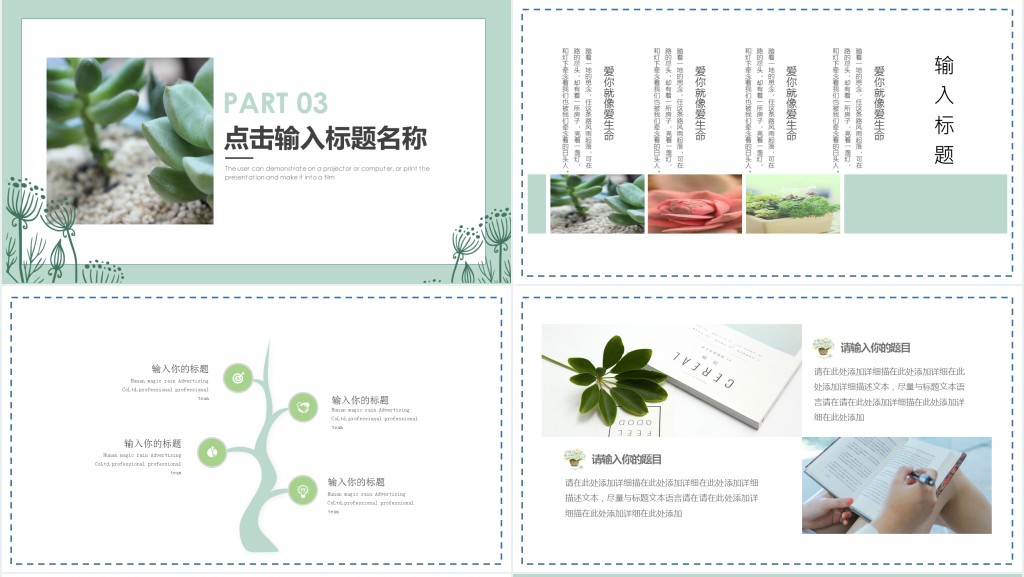这份展示内容将带领观众进入多肉植物的生长过程,从种子发芽到幼苗茁壮生长,再到植株逐渐成熟的全过程。通过图片和图表展示,让观众了解多肉植物在不同生长阶段所需的光照、水分和养分,以及如何进行适当的管理和护理。同时,展示多肉植物在不同季节的生长特点,引导观众根据季节变化调整养护策略,促进植物的健康成长。