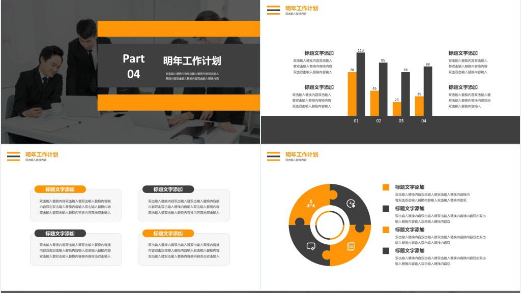 作为年终述职报告的重要部分,商务高档年终述职报告模板设计风格大气、简洁明了,突出公司整体形象和业绩亮点。整个设计风格高端大气,色彩搭配合理,突出重点信息。在内容排版上,注重条理性和逻辑性,通过图表、数据等形式直观展示公司的整体运营情况和发展趋势,提供了清晰而有力的支持。同时,模板中的文字精炼简洁,结合图片和图表形成了一种具有说服力的视觉呈现,为公司的述职工作提供了有力的支持和展示平台。