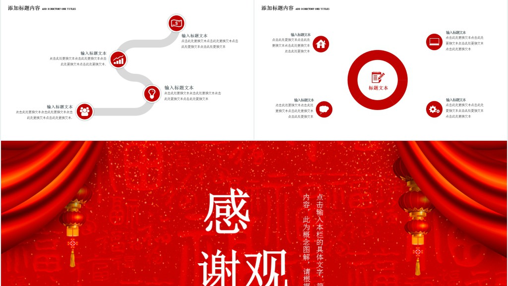 这是一个以中国传统文化为主题的春节庆祝活动展示,充满了浓厚的红色中国风情。整个展示以传统中国元素为设计基础,融入了丰富多彩的中国传统习俗。在展示中,可以感受到热闹喜庆的氛围和浓厚的节日气息。首先,展示的背景色是鲜艳的红色,代表着喜庆和幸福,同时也象征着中国的传统文化。在背景上,绘制了华丽的花鸟图案和吉祥的图腾,增添了整体的艺术感和中国元素。其次,在展示的内容中,有丰富多彩的春节习俗元素。比如,可以看到舞龙舞狮的场景,象征着驱邪祈福和迎接新年的到来。还有烟花爆竹的图案,代表着辞旧迎新和庆祝的喜悦。此外,还可以看到剪纸、灯笼、福字等传统的春节装饰物,每一个都寓意着吉祥和好运。最后,在整个展示中,通过色彩的运用和图案的设计,展现出中国传统文化的独特魅力。每个图案都精心绘制,色彩鲜艳,线条流畅,呈现出浓厚的艺术氛围。展示中的文字少而精炼,以简洁有力的方式传达节日祝福和喜庆的情感。这个红色中国风春节习俗展示的PPT模板,将为你的节日庆典增添更多的喜庆和传统文化的氛围,让观众感受到浓厚的节日气氛,带来一场视觉与文化的盛宴。
