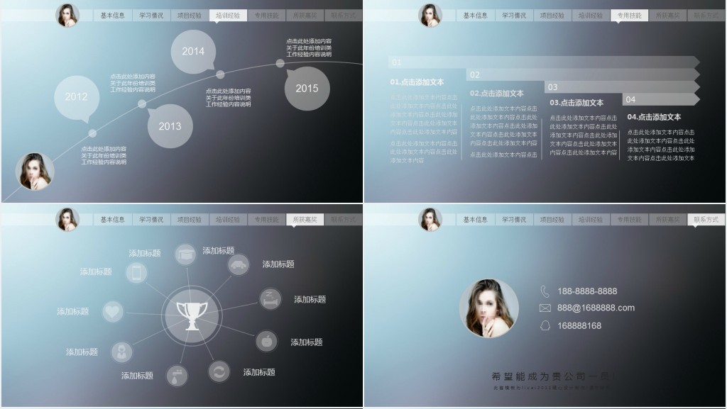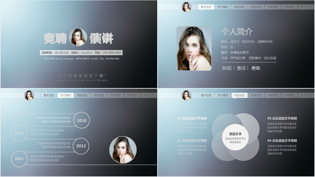 这是一款设计精美、内容简洁的求职竞聘展示模板,旨在帮助个人展示简历信息。该模板以简约风格为基础,采用清晰明了的布局和简洁的图标元素,突出个人简历的重点信息。通过巧妙运用颜色、排版和字体,将个人的教育背景、工作经历、技能专长等关键信息有机地结合在一起,使得整个简历内容一目了然,凸显个人的专业素养和能力。无论您是学生求职还是职场人士转换工作,该模板都能够帮助您快速制作出一份简洁而又引人注目的个人简历展示,并与用人单位建立起有效的沟通和联系。