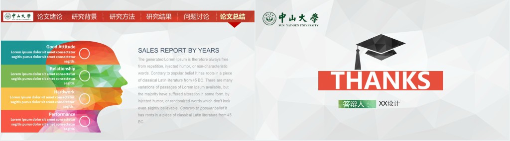 中山大学研究生毕业答辩的设计风格与毕业生的学术研究成果相得益彰。它以简洁、精致的视觉效果为特点,突出展示了研究生在专业领域的深度知识和独立思考能力。设计采用了明亮而温暖的色调,给人以积极、乐观的感受。图表和图像的运用既清晰又富有艺术感,能够很好地传达研究结果和创新思想。整体布局合理,信息层次分明,使观众能够轻松理解和接收到演讲内容。该设计不仅使研究生毕业答辩达到了高标准的学术要求,同时也展现了中山大学对于知识与美的追求。
