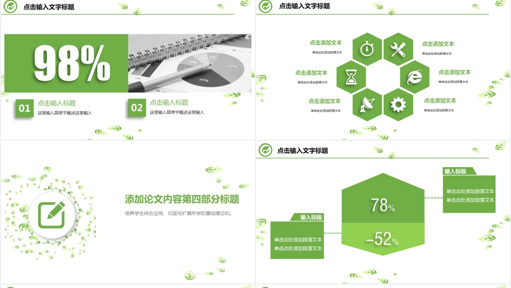 清新树叶答辩模板以清新、自然的绿色为主色调,展现出生机勃勃的氛围。设计简洁大方,让人感受到和谐与宁静。绿色树叶的图案装饰使整体布局更加生动有趣,给人一种清新的视觉享受。该模板设计风格清新自然,适合用于各类演讲场合,为演讲者营造出舒适的氛围,让听众更易于聚焦和理解演讲内容。