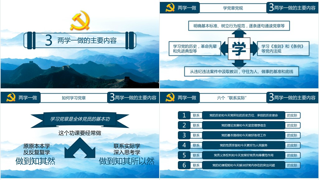 本次学习资料旨在全面深化对“两学一做”理念的理解和实践,通过精心设计的视觉呈现和内容安排,为学习者提供一个清晰、系统的学习路径。资料内容围绕“学党章党规、学系列讲话,做合格党员”的核心要求展开,分为几个重要部分。