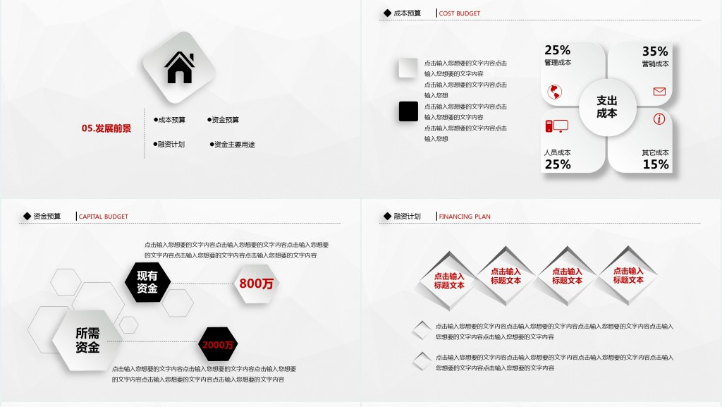 该模板的整体设计风格以白色微粒体为主题,通过精心挑选的图标、图表和配色方案,营造出现代、专业的视觉效果。模板采用多页组合的形式,每一页都有独特的布局和内容,包括项目概述、市场分析、盈利模式、竞争优势等。这些页面结构清晰,内容简洁明了,使投资人能够准确把握核心信息。