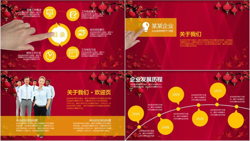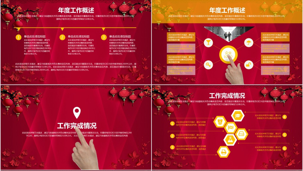 在这个工作汇报年终总结中,我们将以浓厚的中国风为主题,展现出大红色的氛围。整个设计采用了富有中国元素的图案和色彩,烘托出浓厚的中国人民的工作热情和奋斗精神。通过选用传统的中国画风格元素和鲜艳的颜色,我们将工作成果和收获与中国的文化底蕴相结合,体现出我们一年来的努力和成就。每一页都展现了中国特色的图案和装饰,使整个汇报更加具有视觉冲击力和吸引力。同时,我们还使用了一些寓意深远的中国文化符号,如红色代表着热情和活力,金色象征着成功和繁荣,龙图案则代表着力量和雄壮。这些设计元素的精心搭配,使得我们的工作汇报年终总结充满了中国风情,展示了我们在过去一年中所取得的骄人成就和辉煌发展。