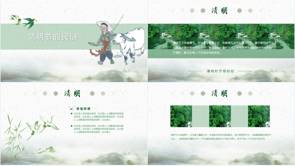 浅绿色的水墨山水背景,如同一幅古老的画卷般展现着清明节的起源和习俗。清明节起源于古代的寒食节,是中国传统节日之一,通常在春季清明时节举行。人们在清明节会祭扫祖先坟墓,悼念先人,表达对逝去亲人的哀思与缅怀之情。此外,也有许多地方会举行一些民俗活动,如踏青、扫墓、挂柳等,以庆祝这个重要的节日。清明节是一个寄托着人们深厚情感和文化传统的节日,也是中华民族的重要传统节日之一。