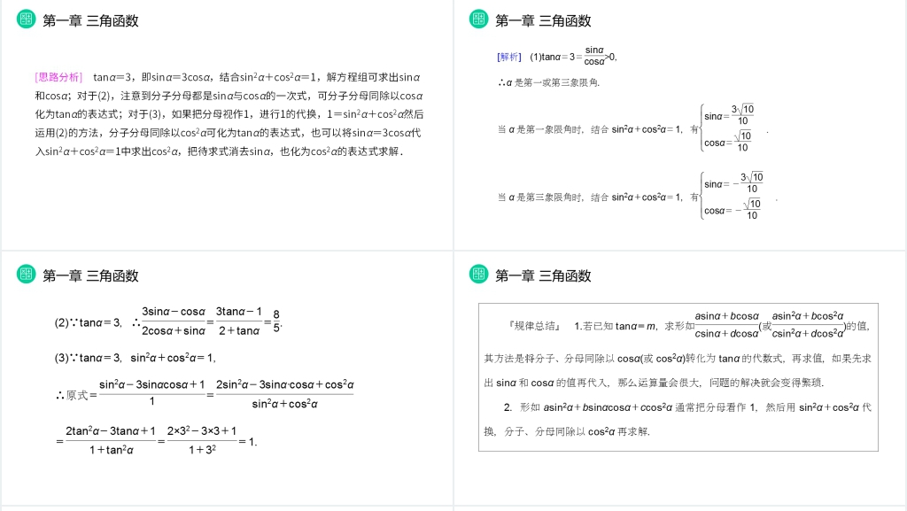 3. 实例演练:组织学生进行一些同角三角函数之间的具体计算和推导,让他们掌握同角三角函数之间的基本关系和相互转化的规律。