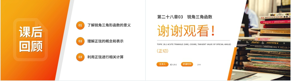 我代表XX学校九年级初三下册数学教师团队,向大家汇报《锐角三角形:正切》这节课的教学总结。本节课的主要内容是介绍锐角三角形中正切的概念和计算方法,并帮助学生掌握和运用正切在实际问题中的应用。