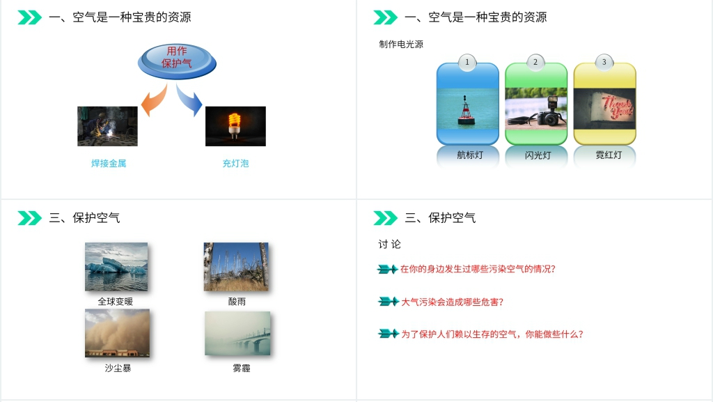 4. 环保意识培养:我们提出了保护空气环境的重要性,引导学生了解大气污染和空气质量指数等概念。通过案例和讨论,帮助学生认识到自己的环保责任,提倡科学用气和减少污染的生活方式。