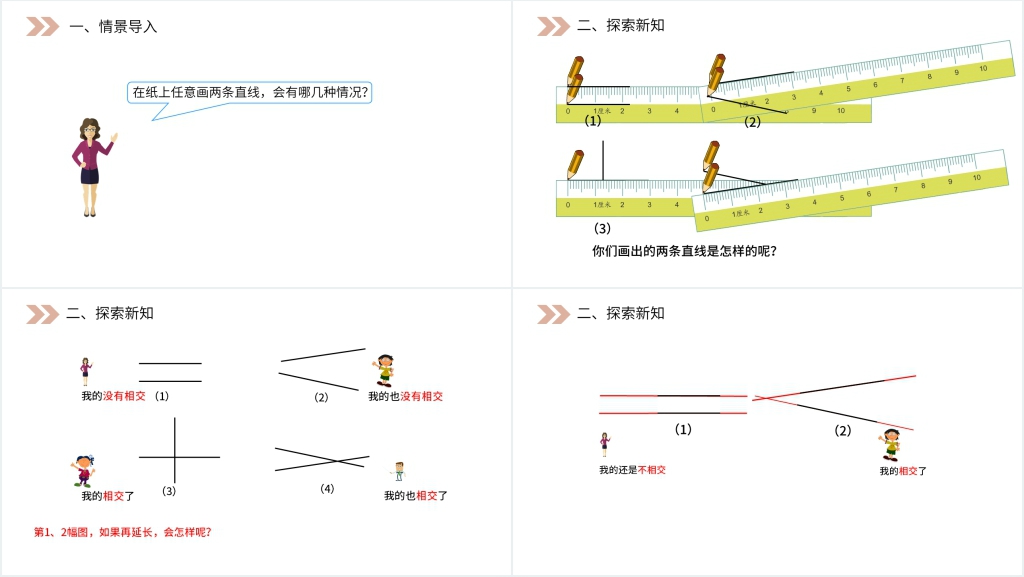 2. 示例展示与讲解:为了让学生更好地理解平行线和垂直线的特征,我们提供了一些具体的示例,并进行详细的讲解。通过这些示例,学生可以观察和比较直线的位置关系、角度和距离等特点,从而深入理解平行线和垂直线的概念。