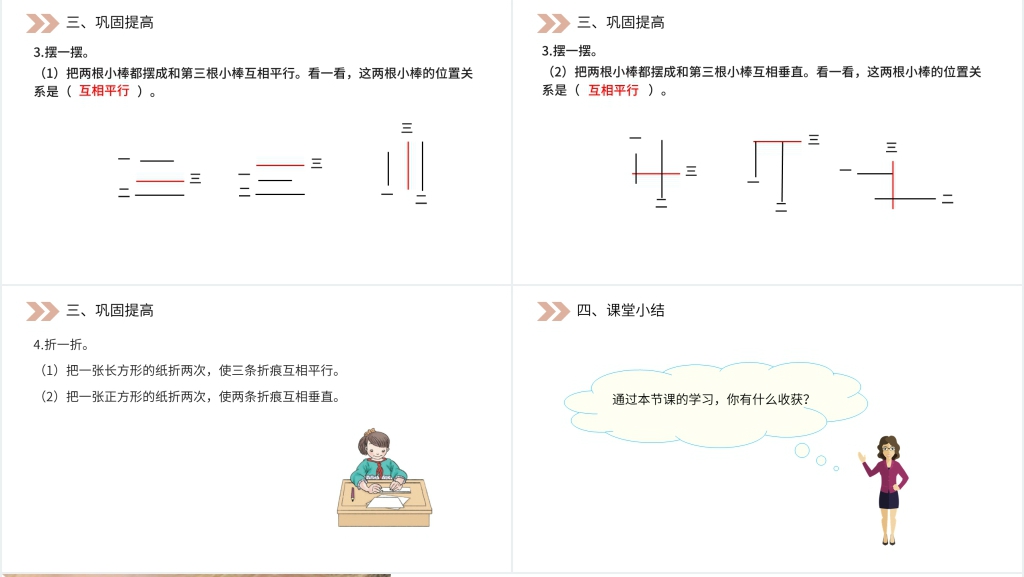4. 实物体验:为了增加学生对平行线和垂直线的实际理解,我们准备了一些实物模型,让学生亲自操作和观察。通过操纵这些实物,学生可以更直观地感受平行线和垂直线的特征,并进一步巩固他们对这些概念的理解。