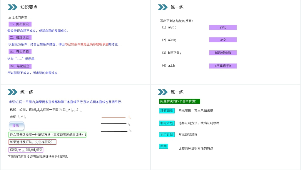本节课程旨在引导学生了解反证法的基本思想和应用方法。在教学过程中,我们采取了以下教学方法和策略: