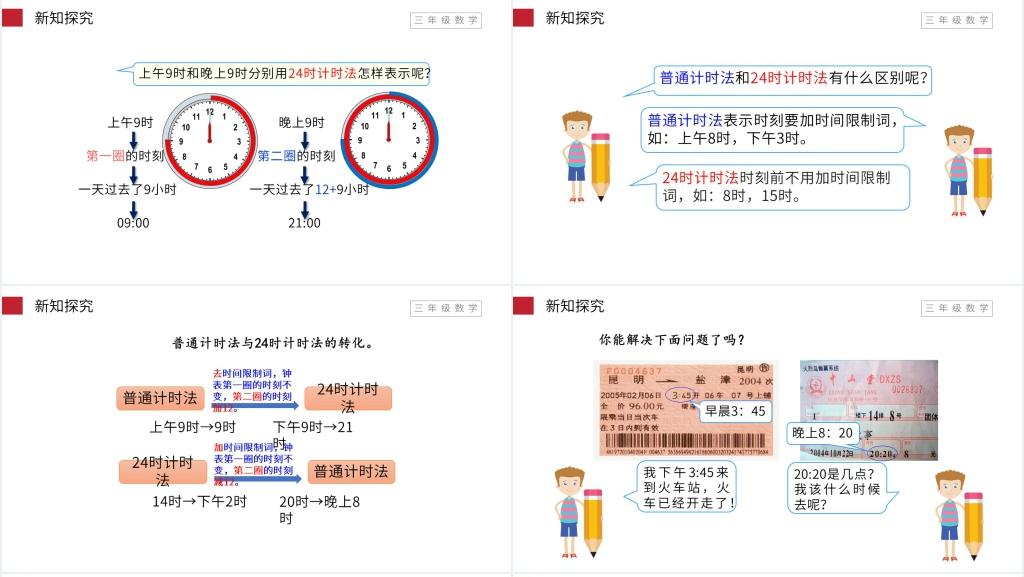 1. 导入新知识:我们通过引入一些日常生活中的时间问题,激发学生对时间的兴趣,并引发他们对24时计时法的思考。我们提出了问题,让学生观察、描述和比较常见的12小时制和24小时制,并引导他们思考24时计时法的优点和使用场景。