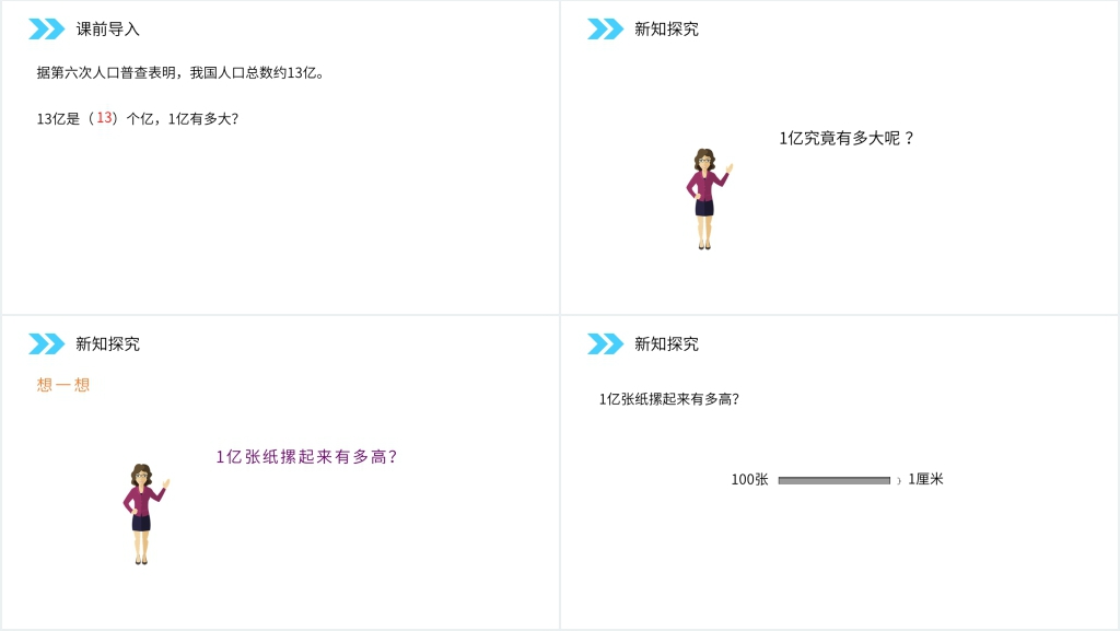4. 实际应用:我们通过一些实际问题的应用,如人口统计、货币计算等。让学生将亿的概念和读写技巧应用到实际生活中,提高他们的问题解决能力和数学思维能力。