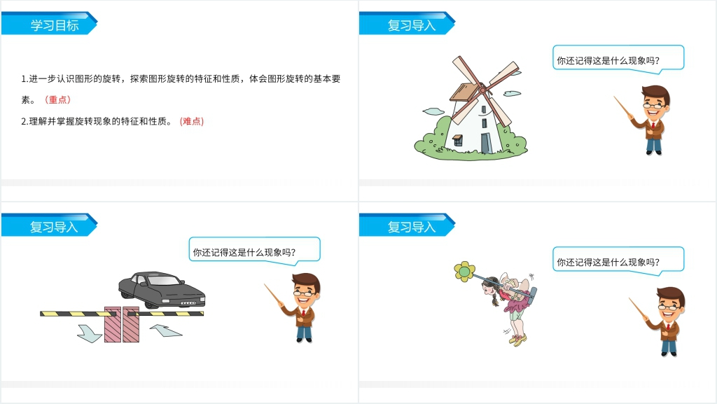 1. 引入概念:我们通过展示生活中的旋转图形的例子,如风车、陀螺等,引起学生的兴趣,并引出图形的旋转概念。同时,我们也解释了旋转的定义和基本概念,让学生理解图形绕定点旋转的含义。