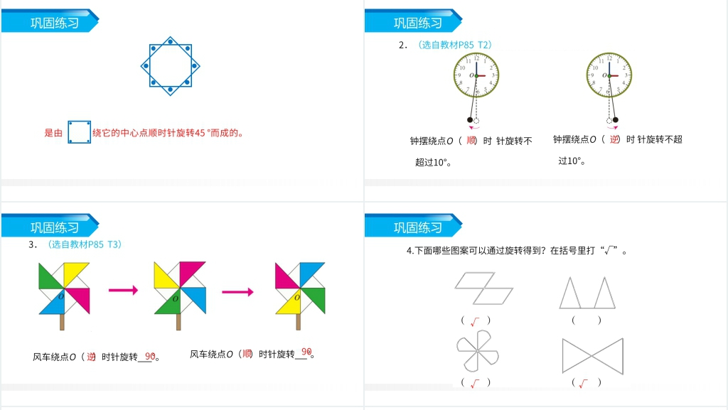 3. 操作演练:我们设计了一系列的旋转操作练习题目,包括指导性的练习和自主完成的练习。通过手工画图和课堂互动,让学生参与到旋转操作中,提高他们的操作技能和直观感受。