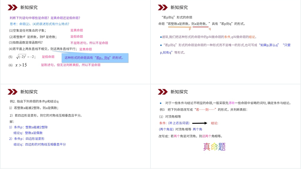 1. 概念引入:在开始授课前,我们引导学生回顾了命题的概念并通过实际例子让学生理解什么是命题。然后,我们详细解释了命题的定义,并通过日常生活中的案例,让学生了解命题与非命题的区别。