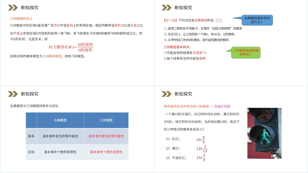 2. 基本概念讲解:我们结合课文的内容,讲解了几何概型的定义和基本性质。重点介绍了等腰三角形、直角三角形和相似三角形等几何概型的特点和应用。通过具体的例子和图示,帮助学生理解和记忆几何概型的重要性。
